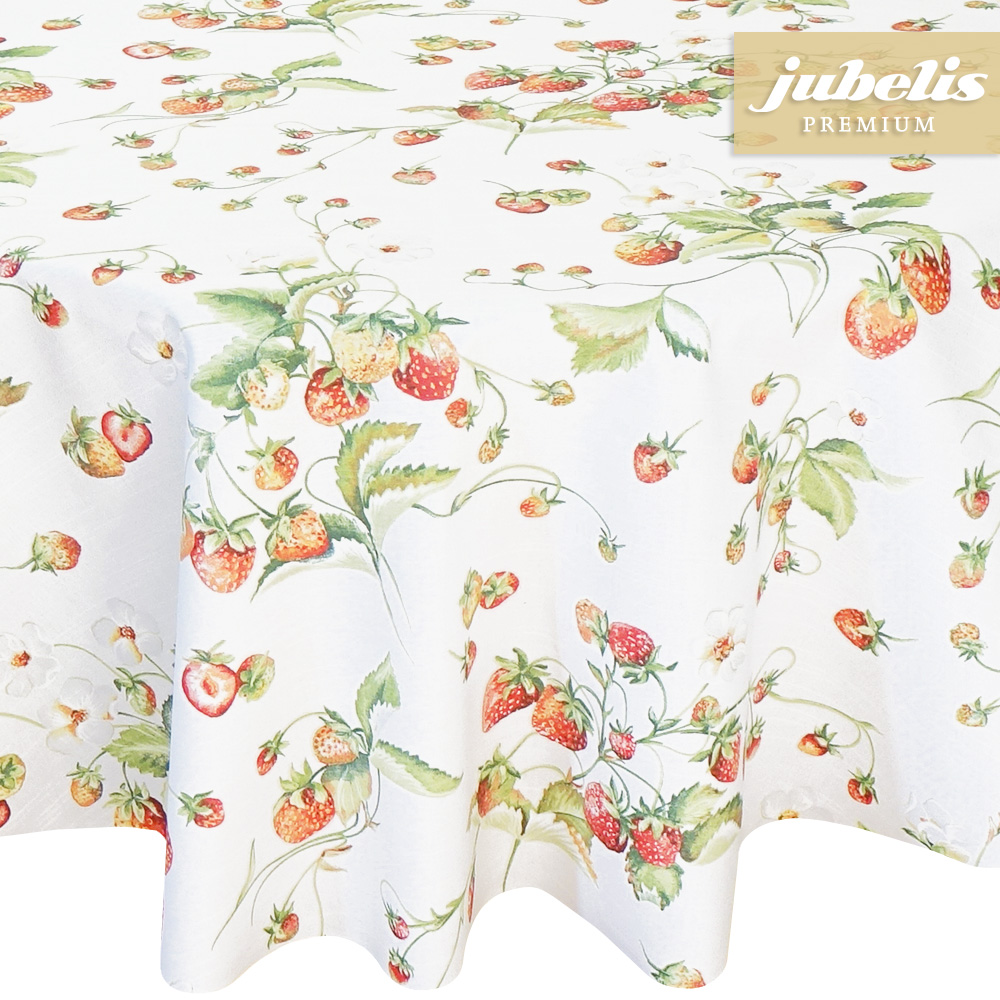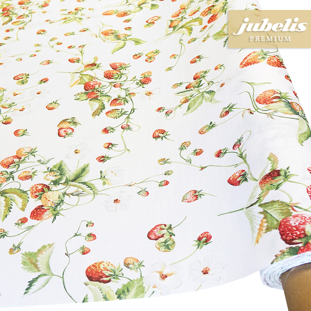 Dieser helle Baumwolltischbelag besitzt ein Musterdruck mit sehr schönen Erdbeer-Blüten und Früchte-Motiven. Die Kombination von hellem Untergrund und großflächigen Erdbeerpflanzen gibt diesem Muster seine freundliche Erscheinung. Aber dieser hochwertige Tischbelag zieht nicht nur die Blicke auf sich, sondern ist auch im Alltag sehr praktisch. Die leicht imprägnierte Oberfläche ist leicht wasserabweisend und lässt sich mit einem feuchten Tuch gut abwischen. Diese praktischen Eigenschaften machen diese Tischwäsche auch für die gastronomische Verwendung interessant. Direkt neben der Produktabbildung finden Sie die verschiedenen Größen und Formen in einem Auswahlmenü. Diesen schönen abwaschbaren Tischbelag können Sie, wenn Sie eine größere Menge an Meterware brauchen, hier auch als eine ganze Rolle kaufen.
