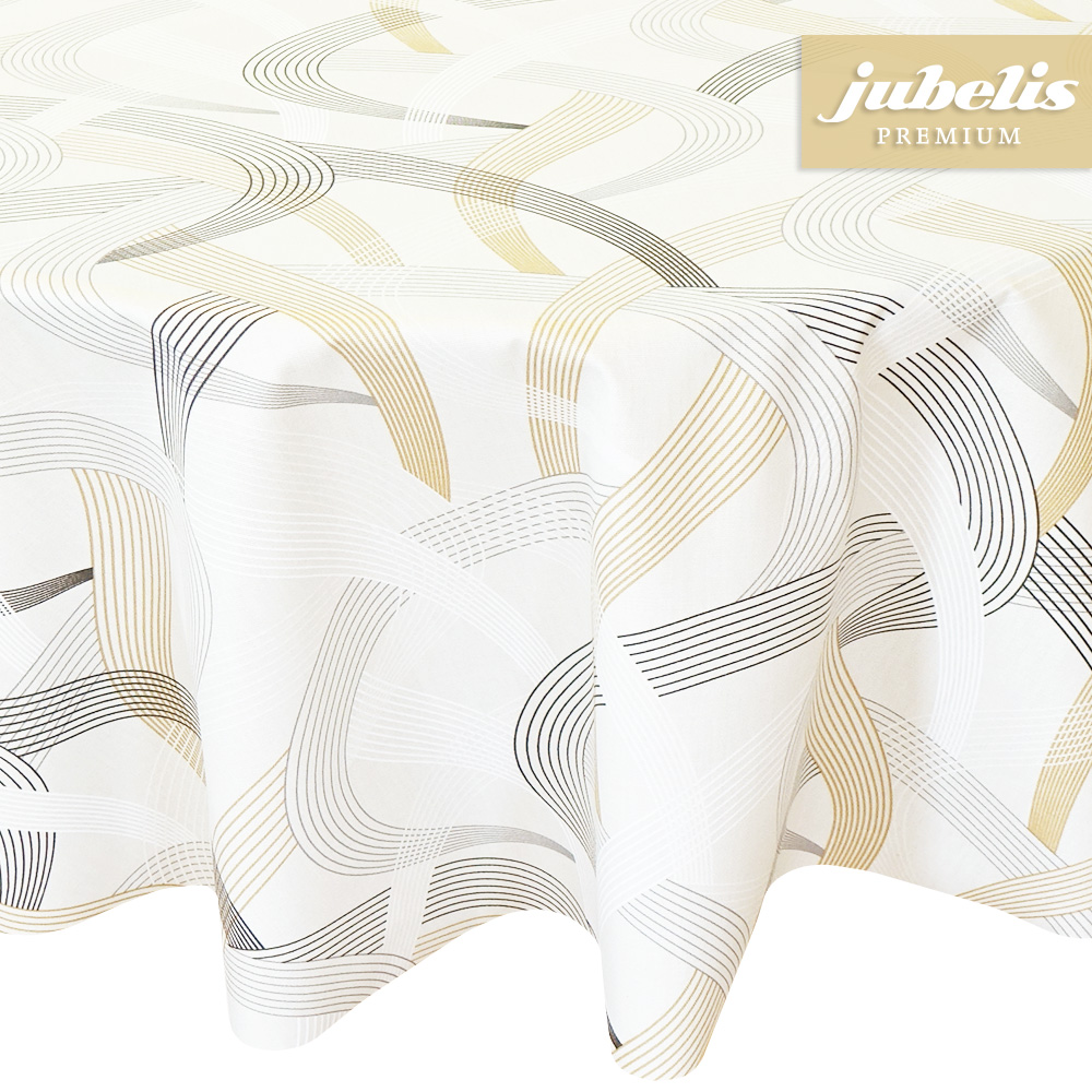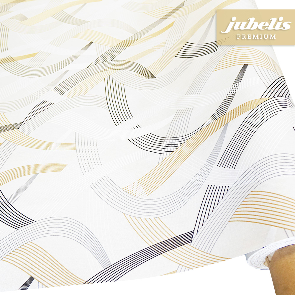 Diese besonders beschichtete Baumwoll-Tischdecke besitzt ein modernes Muster, welches als Hauptbestandteil geschwungene Linie in verschiedenen Farben besitzt. Diese recht modern wirkende Tischwäsche ist aber farblich dezent gestaltet und somit in vielen Wohnbereichen optisch passend einsetzbar. Kommt diese Tischwäsche zur Anwendung, so überrascht sie durch ihre Pflegeleichtigkeit. Denn anders als eine herkömmliche Stofftischdecke kann diese bei leichter Verunreinigung einfach feucht abgewischt werden. Dieses ansprechende Muster ist hier im Shop-Sortiment auch noch in einer etwas kräftigeren Farbstellung verfügbar. Direkt neben der Produktabbildung finden Sie die verschiedenen Größen und Formen in einem Auswahlmenü. Diesen abwaschbaren Tischbelag können Sie, wenn Sie eine größere Menge benötigen, hier als ganze Rolle bestellen.