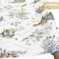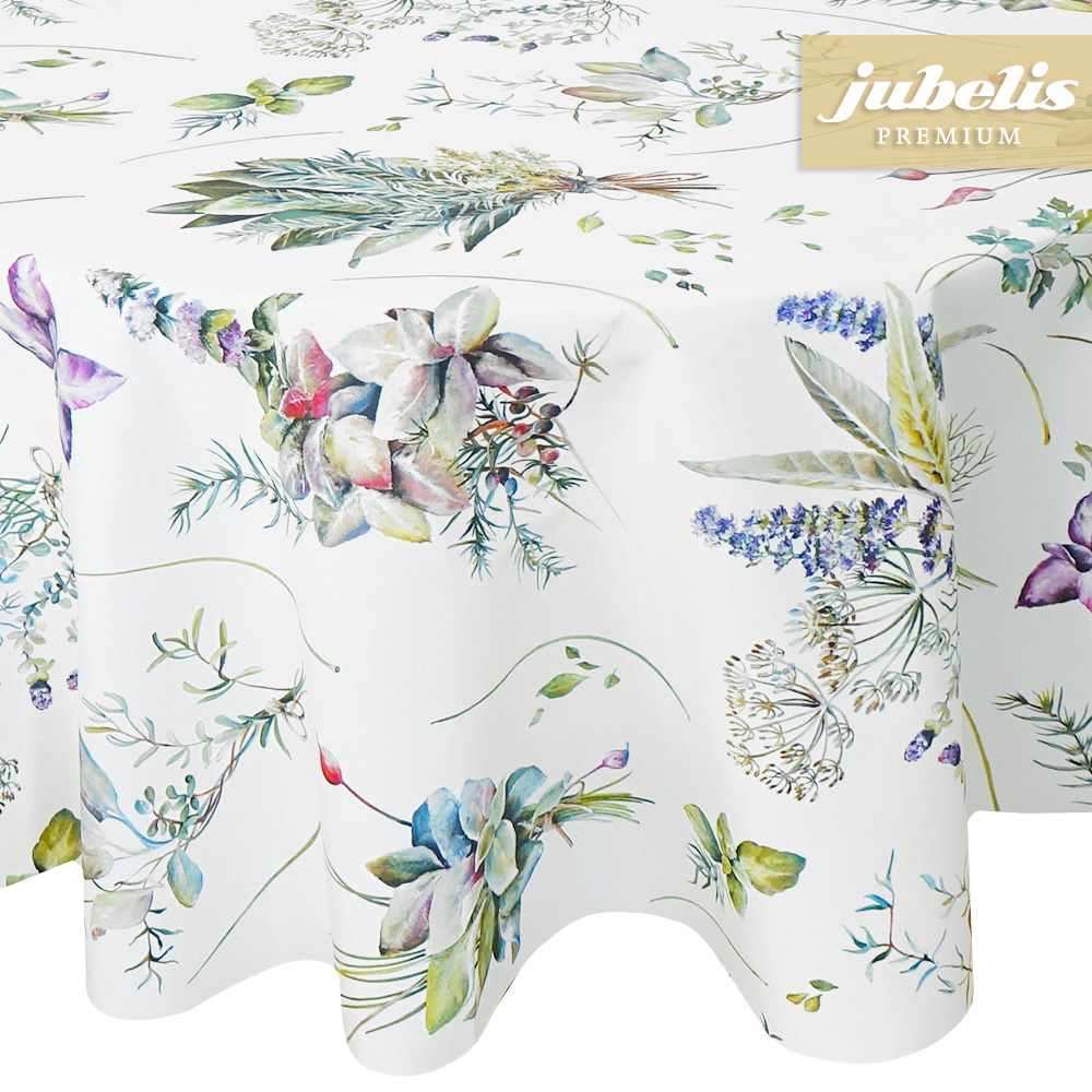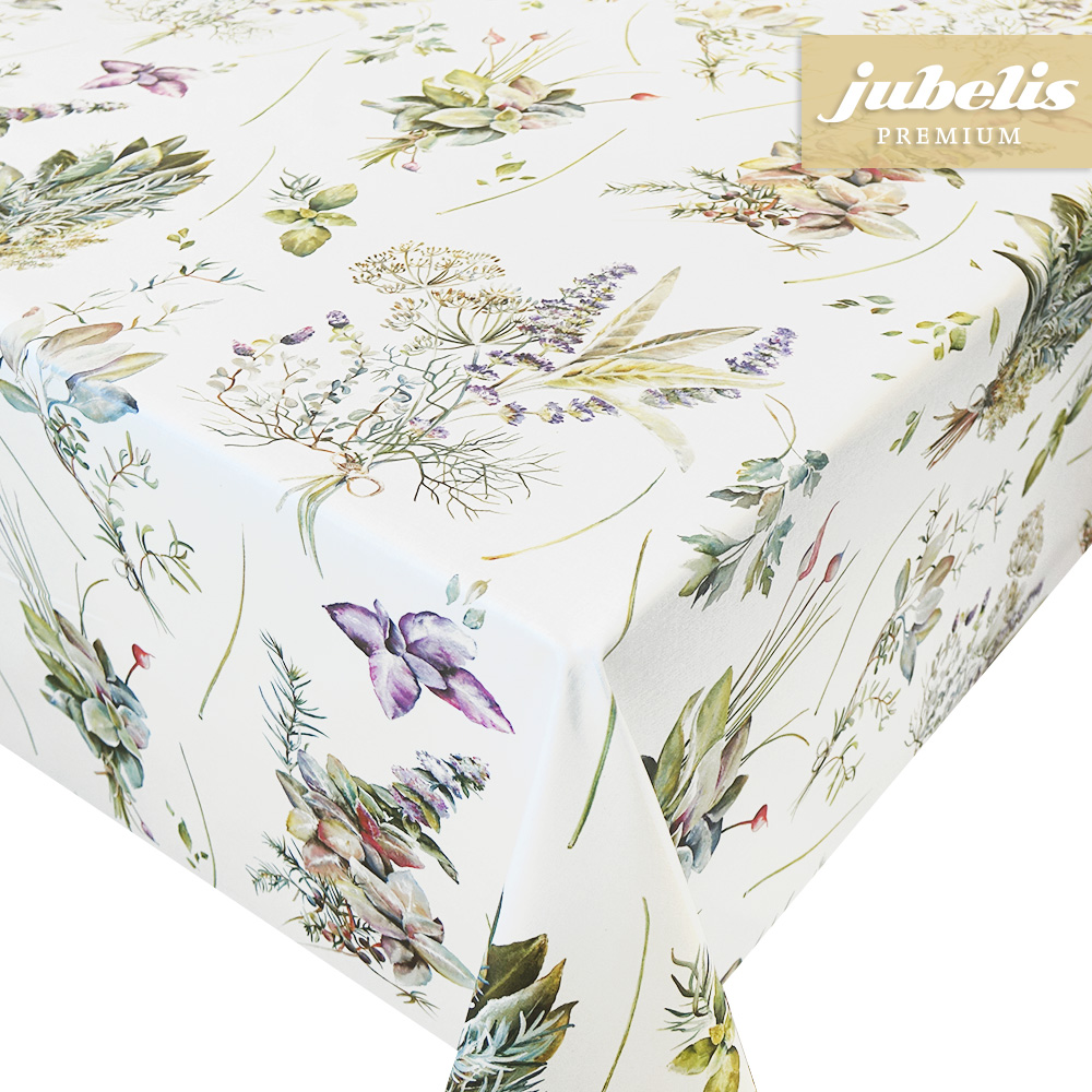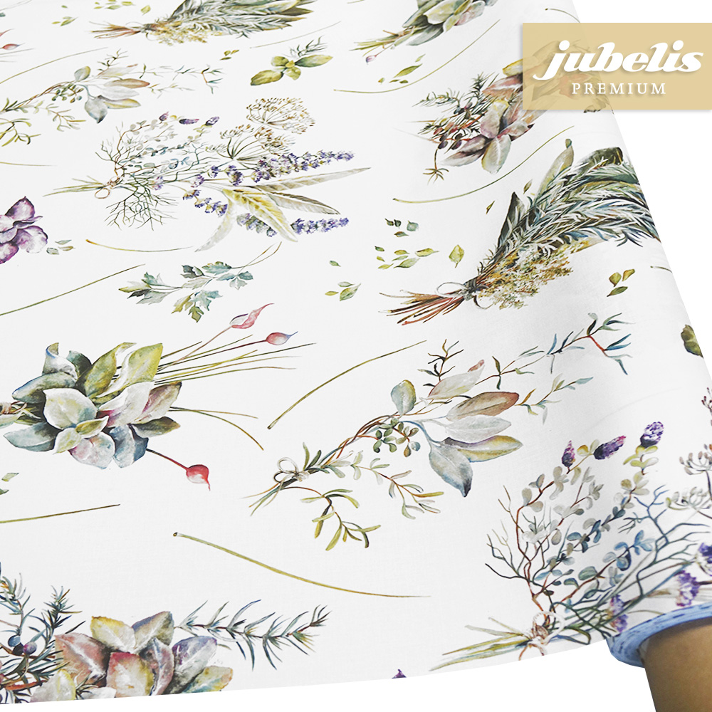 Dieser oberflächenbeschichtete Tischbelag besitzt ein fein gezeichnetes Muster, welches vorrangig verschiedene Kräuter abbildet. Die Abbildungen der Kräuter ziehen sich gleichmäßig über die gesamte Tischwäsche und besitzen eine mittelgroße Abbildungsgröße. Trotz der Weichheit des Materials besitzt diese Tischwäsche eine leicht wasserabweisende Oberfläche. Nutzen Sie diese beschichtete Tischwäsche, um im Wohnbereich dezente Akzente zu setzen. Der hochwertige Tischbelag ist als Meterware in vielen verschiedenen Abmessungen erhältlich und kann somit passend bestellt werden. Wählen Sie in der Größenauswahl direkt neben der Produktabbildung die gewünschte Größe und Form Ihrer neuen Tischdecke. Das klassisch-elegante Spitzenprodukt für den Tisch aus Italien zeichnet sich letztlich durch seine Unempfindlichkeit und seine attraktive Erscheinung aus.