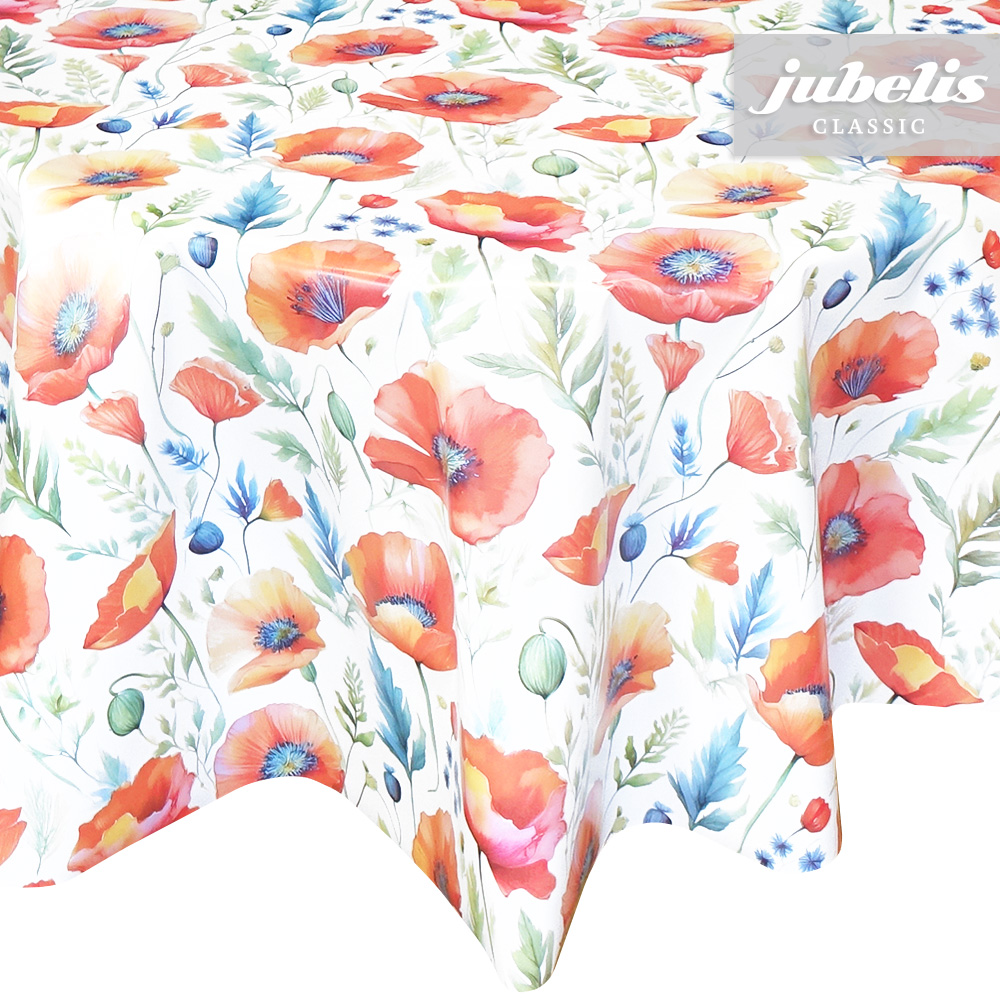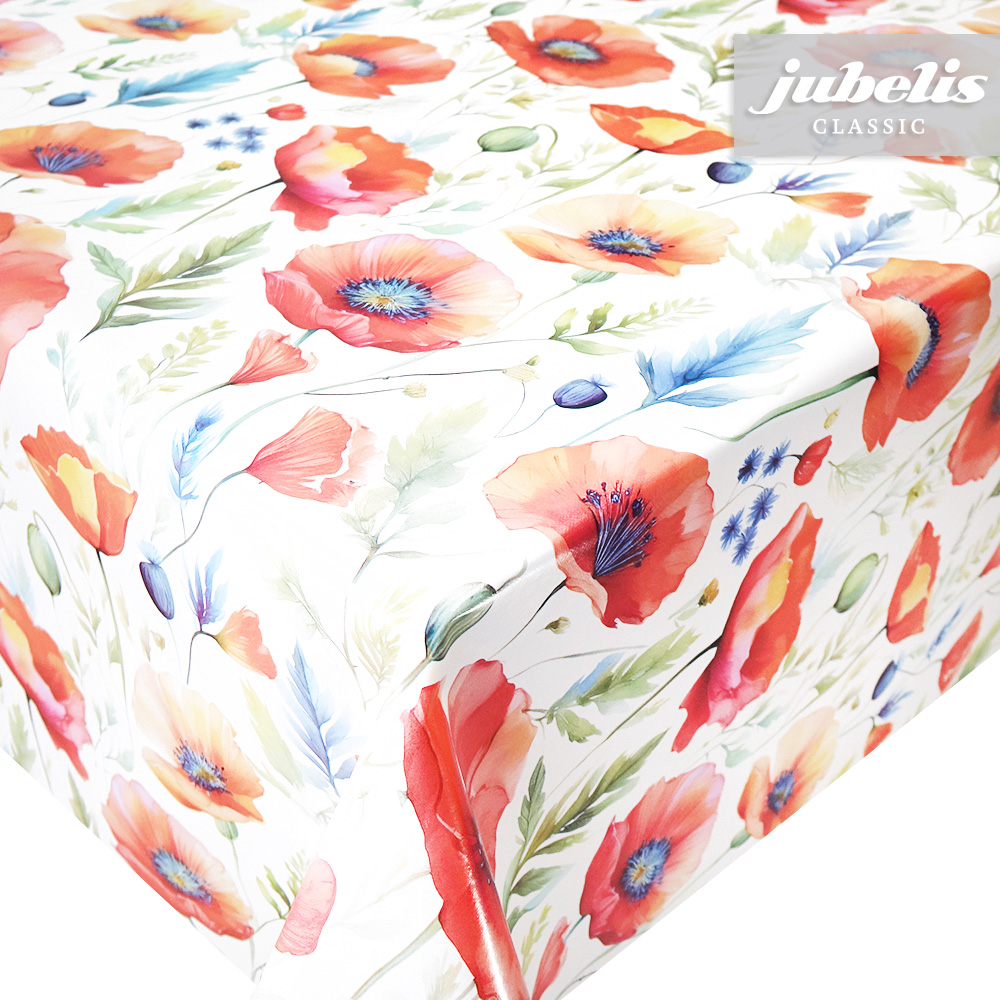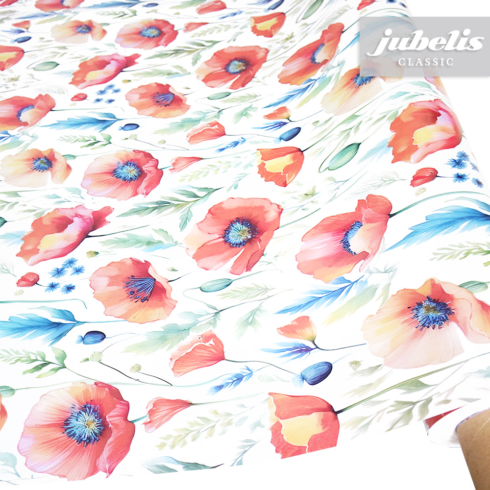 Dieses Wachstuch bietet ein auffälliges Muster mit kräftigen Farben. Mit dieser Tischdecke bekommen Sie nicht nur eine pflegeleichte Tischwäsche, sondern auch ein optisches Gestaltungselement zur Aufwertung des Wohnbereiches. Die Abbildung der Mohnblüten ziehen sich eng und gleichmäßig über den gesamten Tischbelag. Dank der besonderen Produkteigenschaften ist dieses Wachstuch sowohl für die private als auch für die gewerbliche Anwendung bestens geeignet. Das Wachstuch mit seinem weichen Vliesrücken und einer glatten Oberfläche schützt empfindliche Tischoberflächen und lässt sich durch feuchtes Abwischen einfach reinigen. Da die Oberfläche wasserabweisend ist, kann das Wachstuch sowohl im Innen- als auch im Außenbereich eingesetzt werden. Profitieren auch Sie von diesem gleichermaßen ansprechenden und pflegeleichten Tischbelag aus Wachstuch. Dieser schöne Tischbelag ist hier als Tischdecke, Meterware oder ganze Rolle erhältlich. Direkt neben der Produktabbildung finden Sie das Auswahlmenü, in dem Sie Größe und Form wählen können. Benötigen Sie von diesem schönen und praktischen Wachstuch eine größere Anzahl, so bietet sich der Kauf einer ganzen Rolle an, die zusätzlich zu unserem günstigen Meterpreis abermals rabattiert ist.