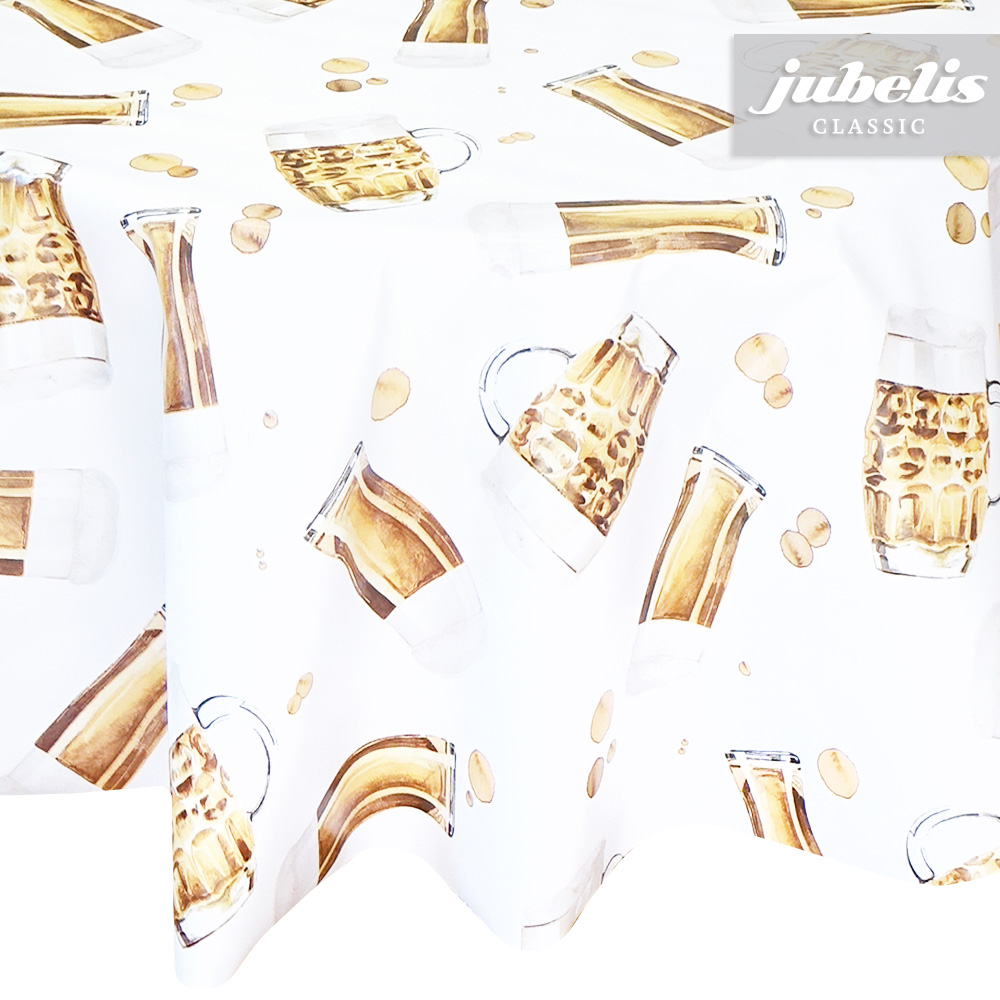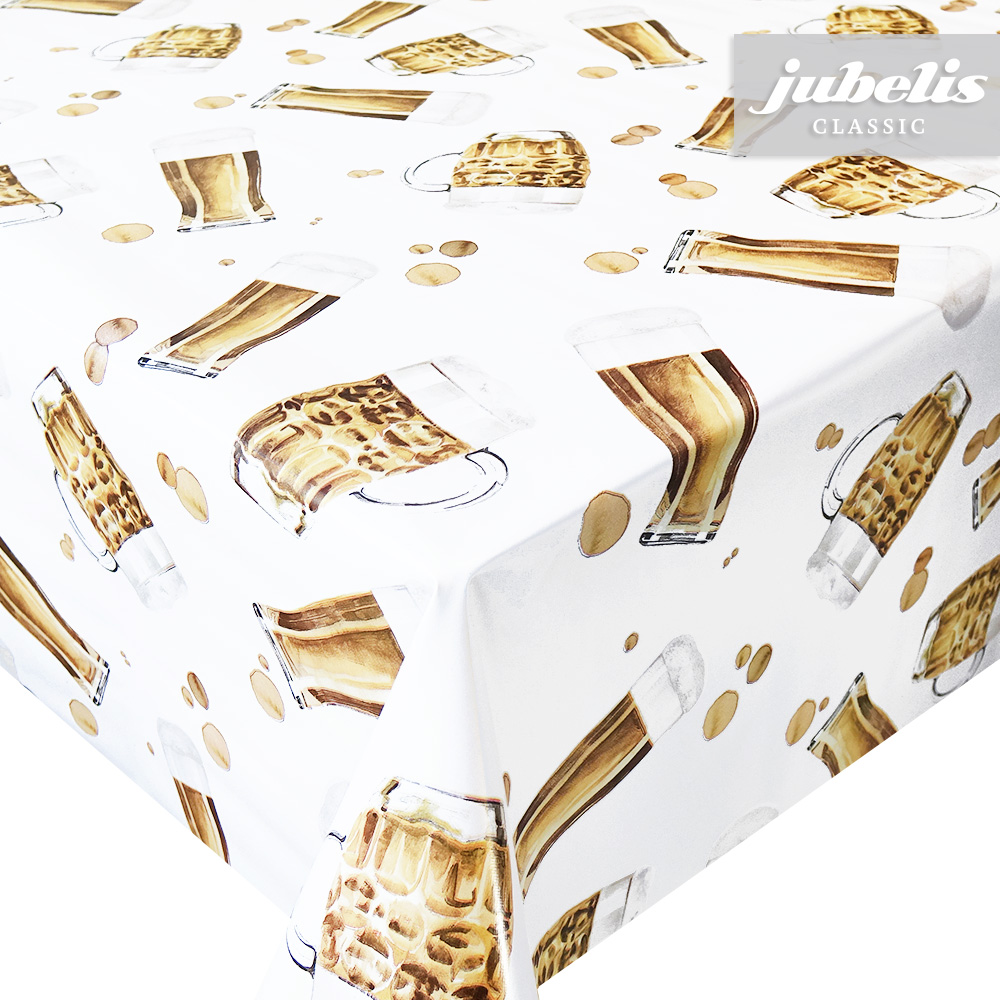 Mit dieser originellen Wachstuch-Tischdecke sorgen Sie für gute Stimmung. Steht bei Ihnen vielleicht ein leckeres Bier auf dem Speiseplan? Falls nicht, dann müssen Sie nicht ganz darauf verzichten. Ihr Esstisch bietet die passende Grundlage für dieses außergewöhnliche Muster. Dank der besonderen Produkteigenschaften ist dieses Wachstuch sowohl für die private als auch für die gewerbliche Anwendung bestens geeignet. Das Wachstuch mit seinem weichen Vliesrücken und einer glatten Oberfläche schützt empfindliche Tischoberflächen und lässt sich durch feuchtes Abwischen einfach reinigen. Da die Oberfläche wasserabweisend ist, kann das Wachstuch sowohl im Innen- als auch im Außenbereich eingesetzt werden. Profitieren auch Sie von diesem gleichermaßen ansprechenden und pflegeleichten Tischbelag aus Wachstuch. Dieser schöne Tischbelag ist hier als Tischdecke, Meterware oder ganze Rolle erhältlich. Direkt neben der Produktabbildung finden Sie das Auswahlmenü, in dem Sie Größe und Form wählen können. Benötigen Sie von diesem schönen und praktischen Wachstuch eine größere Anzahl, so bietet sich der Kauf einer ganzen Rolle an, die zusätzlich zu unserem günstigen Meterpreis abermals rabattiert ist.