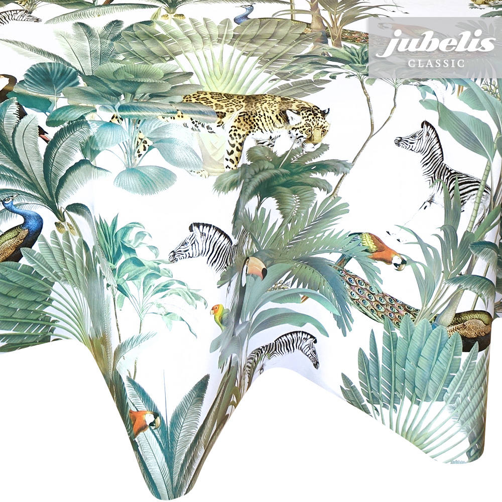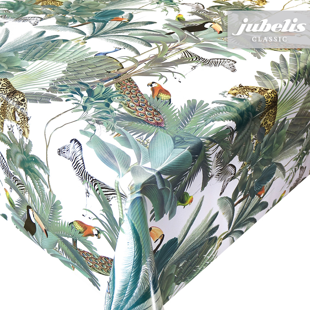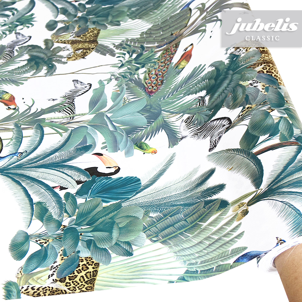 Auf diesen exotischen Tischbelag aus Wachstuch gibt es einiges zu entdecken. Der Musterdruck dieses Wachstums erinnert schon stark an ein Wimmelbild. Die verschiedenen Tiere und Pflanzen sind gleichmäßig über den gesamten Tischbelag verstreut. Bringen Sie mit diesem Wachstum frischen Schwung in Ihren Wohnbereich. Dank der besonderen Produkteigenschaften ist dieses Wachstuch sowohl für die private als auch für die gewerbliche Anwendung bestens geeignet. Das Wachstuch mit seinem weichen Vliesrücken und einer glatten Oberfläche schützt empfindliche Tischoberflächen und lässt sich durch feuchtes Abwischen einfach reinigen. Da die Oberfläche wasserabweisend ist, kann das Wachstuch sowohl im Innen- als auch im Außenbereich eingesetzt werden. Profitieren auch Sie von diesem gleichermaßen ansprechenden und pflegeleichten Tischbelag aus Wachstuch. Dieser schöne Tischbelag ist hier als Tischdecke, Meterware oder ganze Rolle erhältlich. Direkt neben der Produktabbildung finden Sie das Auswahlmenü, in dem Sie Größe und Form wählen können. Benötigen Sie von diesem schönen und praktischen Wachstuch eine größere Anzahl, so bietet sich der Kauf einer ganzen Rolle an, die zusätzlich zu unserem günstigen Meterpreis abermals rabattiert ist.