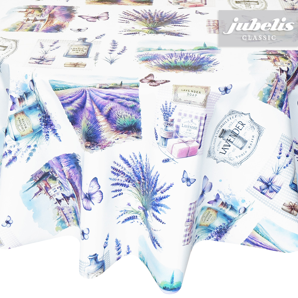 Jetzt können Sie Frankreichs Flair zu sich nach Hause holen. Setzen Sie mit diesem Lavendel-Motiv französische Dekor-Akzente. Alle Abbildungen dieses Musters sind gleichmäßig über diesen Tischbelag, der aus Wachstuch besteht, aufgeteilt. Diese farbenfrohe, abwaschbare Tischwäsche hat eine glatte Oberfläche und ist somit relativ unempfindlich und somit im Innen- und Außenbereich einsetzbar. Eine weiche Vlies-Rückseite verhindert ein zu leichtes Verrutschen der Tischdecke auf der Tischoberfläche. In der Größenauswahl finden Sie verschiedenste Formen und Größen, die Sie dort einfach auswählen können. Benötigen Sie von dieser attraktiven Meterware eine größere Menge, so empfiehlt sich hier der Kauf einer ganzen Rolle mit entsprechendem Rabatt. Nutzen auch Sie diesen praktischen und pflegeleichten Tischbelag.