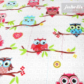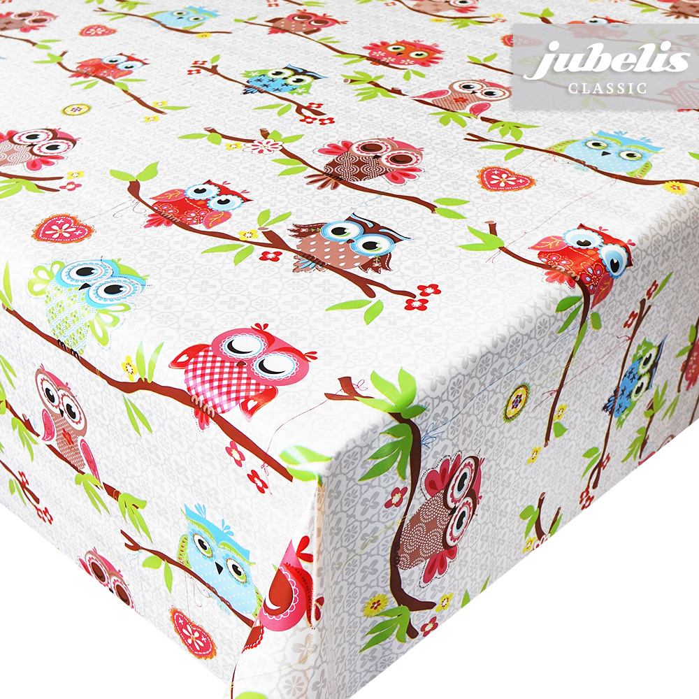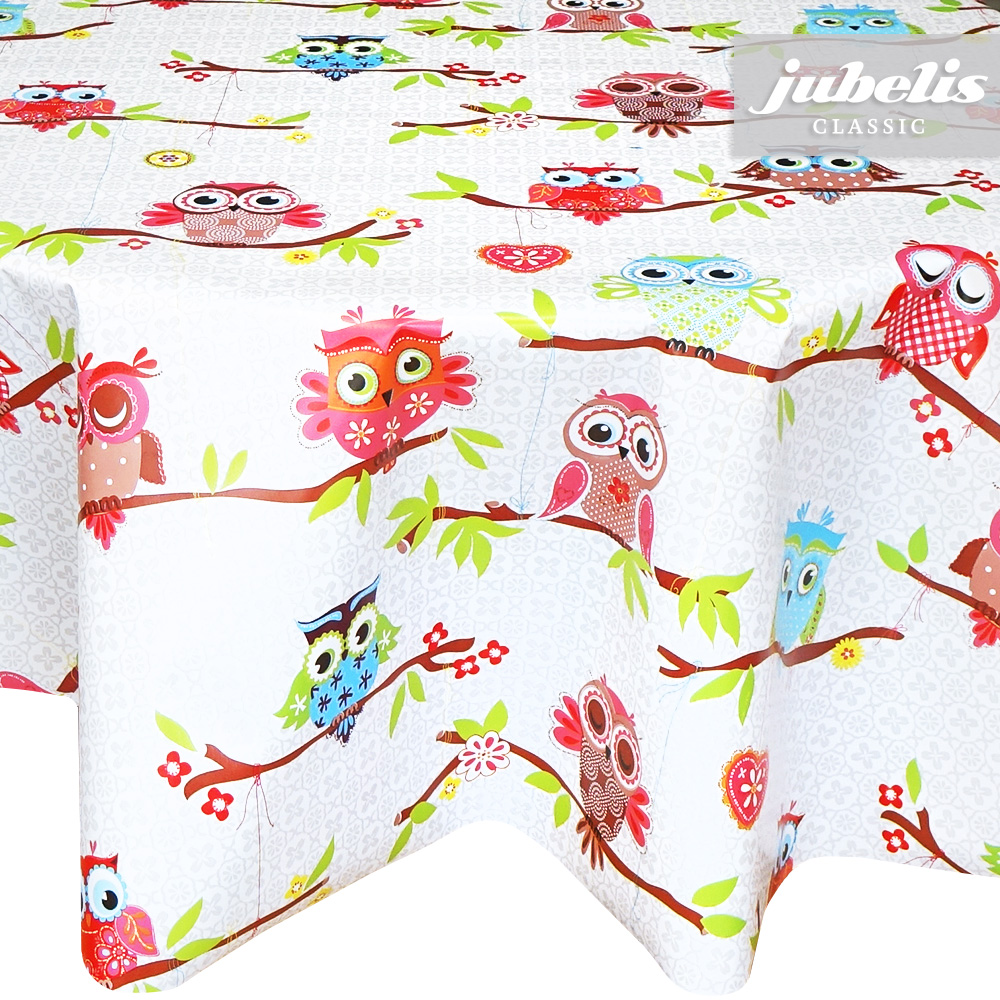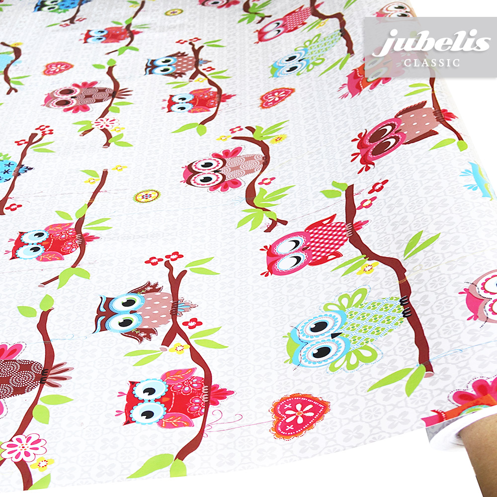 Hauptbestandteil dieses Wachstuchs sind verschiedene lustige Abbildungen von Eulen. Verschiedene andere grafische Elemente in freundlichen Farben ergänzen die Optik der Tischdecke sinnvoll. Nutzen Sie die farbenfrohen Muster und bringen Sie so frischen Schwung in Ihren Wohnbereich. Das Wachstuch mit seinem weichen Vliesrücken und einer glatten Oberfläche schützt empfindliche Tischoberflächen und lässt sich durch feuchtes Abwischen einfach reinigen. Da die Oberfläche wasserabweisend ist, kann das Wachstuch sowohl im Innen- als auch im Außenbereich eingesetzt werden. Das Muster wird hier im Shop auch noch in anderen Farben angeboten. Profitieren auch Sie von diesem gleichermaßen ansprechenden und pflegeleichten Tischbelag aus Wachstuch. Dieser schöne Tischbelag ist hier als Tischdecke, Meterware oder ganze Rolle erhältlich. Direkt neben der Produktabbildung finden Sie das Auswahlmenü, in dem Sie Größe und Form wählen können. Benötigen Sie von diesem schönen und praktischen Wachstuch eine größere Anzahl, so bietet sich hier der Kauf einer ganzen Rolle an, die zusätzlich zu unserem günstigen Meterpreis abermals rabattiert ist.