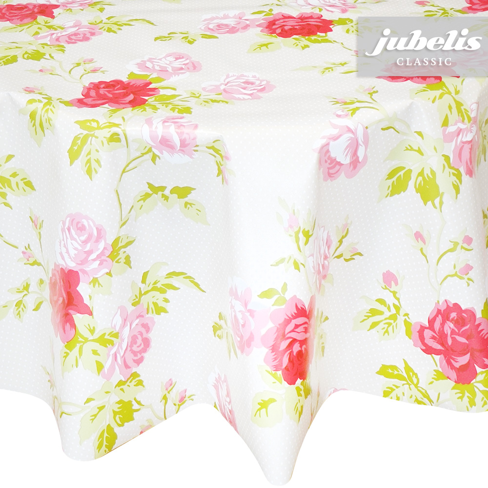 Dieses Wachstuch bietet ein schönes Rosenmuster auf einem bedeckten Untergrund, der leicht gepunktet ist. Die Kombination aller Bestandteile dieses Musters ergibt einen optisch ansprechenden Tischbelag, der dank seiner Produkteigenschaften auch im Alltag überzeugen kann. Das Wachstuch mit seinem weichen Vliesrücken und einer glatten Oberfläche schützt empfindliche Tischoberflächen und lässt sich durch feuchtes Abwischen einfach reinigen. Da die Oberfläche wasserabweisend ist, kann das Wachstuch sowohl im Innen- als auch im Außenbereich eingesetzt werden. Das Muster wird hier im Shop auch noch in anderen Farben angeboten. Profitieren auch Sie von diesem gleichermaßen ansprechenden und pflegeleichten Tischbelag aus Wachstuch. Dieser schöne Tischbelag ist hier als Tischdecke, Meterware oder ganze Rolle erhältlich. Direkt neben der Produktabbildung finden Sie das Auswahlmenü, in dem Sie Größe und Form wählen können. Benötigen Sie von diesem schönen und praktischen Wachstuch eine größere Anzahl, so bietet sich hier der Kauf einer ganzen Rolle an, die zusätzlich zu unserem günstigen Meterpreis abermals rabattiert ist.