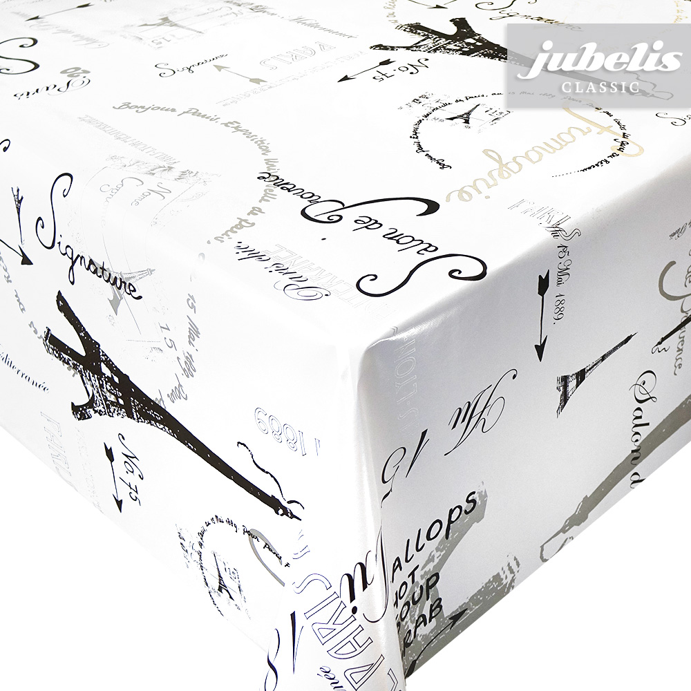 Dieses recht helle Wachstuch besitzt verschiedene Schriftzüge und Abbildungen vom Eiffelturm in verschiedenen Größen und sorgt so für etwas französisches Flair. Die grafischen Elemente ziehen sich gleichmäßig über den gesamten Tischbelag. Dank der besonderen Produkteigenschaften ist dieses Wachstuch sowohl für die private als auch für die gewerbliche Anwendung bestens geeignet. Das Wachstuch mit seinem weichen Vliesrücken und einer glatten Oberfläche schützt empfindliche Tischoberflächen und lässt sich durch feuchtes Abwischen einfach reinigen. Da die Oberfläche wasserabweisend ist, kann das Wachstuch sowohl im Innen- als auch im Außenbereich eingesetzt werden. Profitieren auch Sie von diesem gleichermaßen ansprechenden und pflegeleichten Tischbelag aus Wachstuch. Dieser schöne Tischbelag ist hier als Tischdecke, Meterware oder ganze Rolle erhältlich. Direkt neben der Produktabbildung finden Sie das Auswahlmenü, in dem Sie Größe und Form wählen können. Benötigen Sie von diesem schönen und praktischen Wachstuch eine größere Anzahl, so bietet sich der Kauf einer ganzen Rolle an, die zusätzlich zu unserem günstigen Meterpreis abermals rabattiert ist.