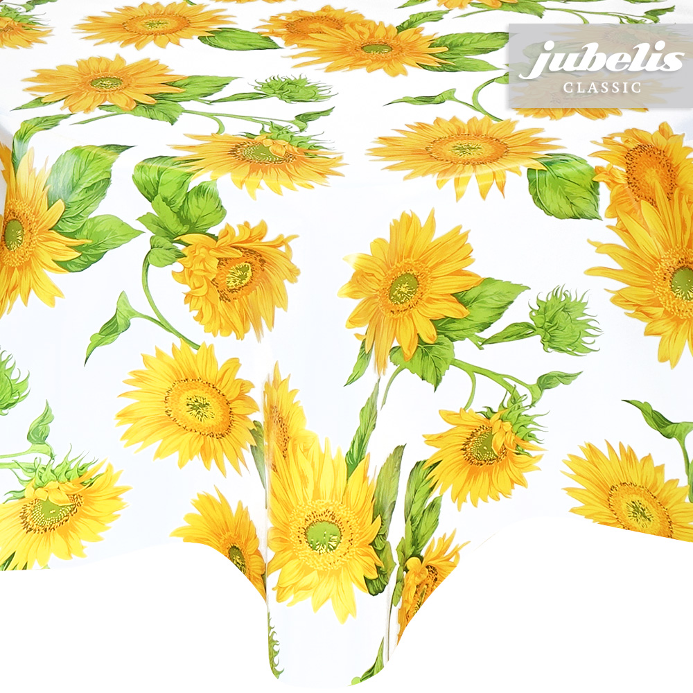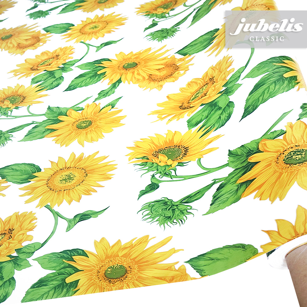 Das Sonnenblumenmuster vom Wachstuch Solea verbreitet gute Stimmung. Dabei sind die Abbildungen der Blüten und Blätter als groß zu bezeichnen und fallen direkt ins Auge. Diese schöne Tischdecke ist sowohl für den Innenraum als auch für den Gartenbereich oder für die gastronomische Verwendung geeignet. Dank der besonderen Produkteigenschaften ist dieses Wachstuch sowohl für die private als auch für die gewerbliche Anwendung bestens geeignet. Das Wachstuch mit seinem weichen Vliesrücken und einer glatten Oberfläche schützt empfindliche Tischoberflächen und lässt sich durch feuchtes Abwischen einfach reinigen. Da die Oberfläche wasserabweisend ist, kann das Wachstuch sowohl im Innen- als auch im Außenbereich eingesetzt werden. Profitieren auch Sie von diesem gleichermaßen ansprechenden und pflegeleichten Tischbelag aus Wachstuch. Dieser schöne Tischbelag ist hier als Tischdecke, Meterware oder ganze Rolle erhältlich. Direkt neben der Produktabbildung finden Sie das Auswahlmenü, in dem Sie Größe und Form wählen können. Benötigen Sie von diesem schönen und praktischen Wachstuch eine größere Anzahl, so bietet sich der Kauf einer ganzen Rolle an, die zusätzlich zu unserem günstigen Meterpreis abermals rabattiert ist.