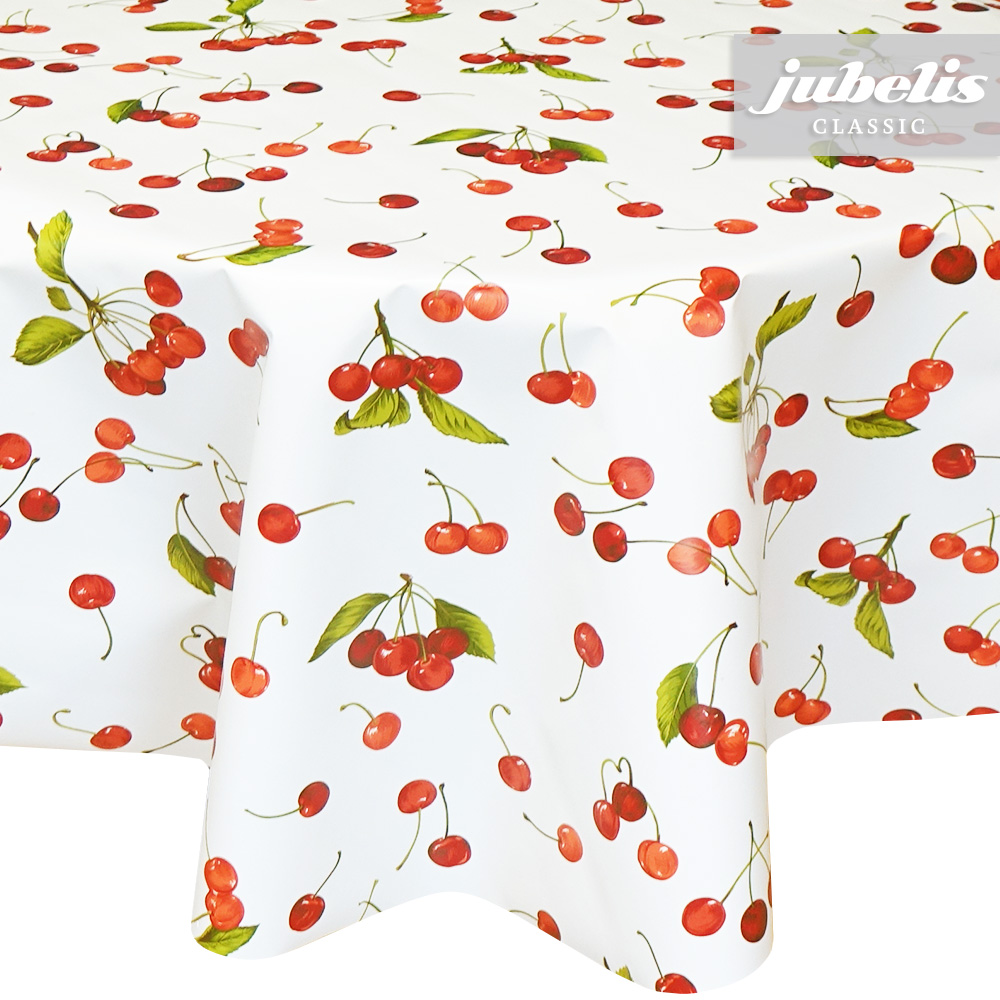Dieses Wachstuch bietet ein Muster, das fest in Verbindung mit dem Sommer steht. Auf hellem Grund befinden sich bei diesem Tischbelag detaillierte Abbildungen von einzelnen und mehreren an Zweigen befindlichen Kirschen. Bringen Sie mit diesem Muster Farbe in Ihren Wohnbereich und sorgen Sie so für gute Stimmung. Dank der besonderen Produkteigenschaften ist dieses Wachstuch sowohl für die private als auch für die gewerbliche Anwendung bestens geeignet. Das Wachstuch mit seinem weichen Vliesrücken und einer glatten Oberfläche schützt empfindliche Tischoberflächen und lässt sich durch feuchtes Abwischen einfach reinigen. Da die Oberfläche wasserabweisend ist, kann das Wachstuch sowohl im Innen- als auch im Außenbereich eingesetzt werden. Profitieren auch Sie von diesem gleichermaßen ansprechenden und pflegeleichten Tischbelag aus Wachstuch. Dieser schöne Tischbelag ist hier als Tischdecke, Meterware oder ganze Rolle erhältlich. Direkt neben der Produktabbildung finden Sie das Auswahlmenü, in dem Sie Größe und Form wählen können. Benötigen Sie von diesem schönen und praktischen Wachstuch eine größere Anzahl, so bietet sich der Kauf einer ganzen Rolle an, die zusätzlich zu unserem günstigen Meterpreis abermals rabattiert ist.